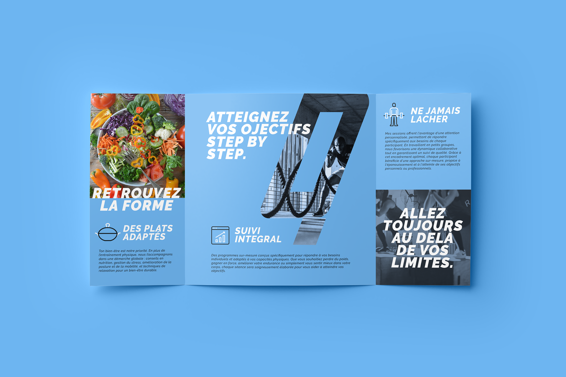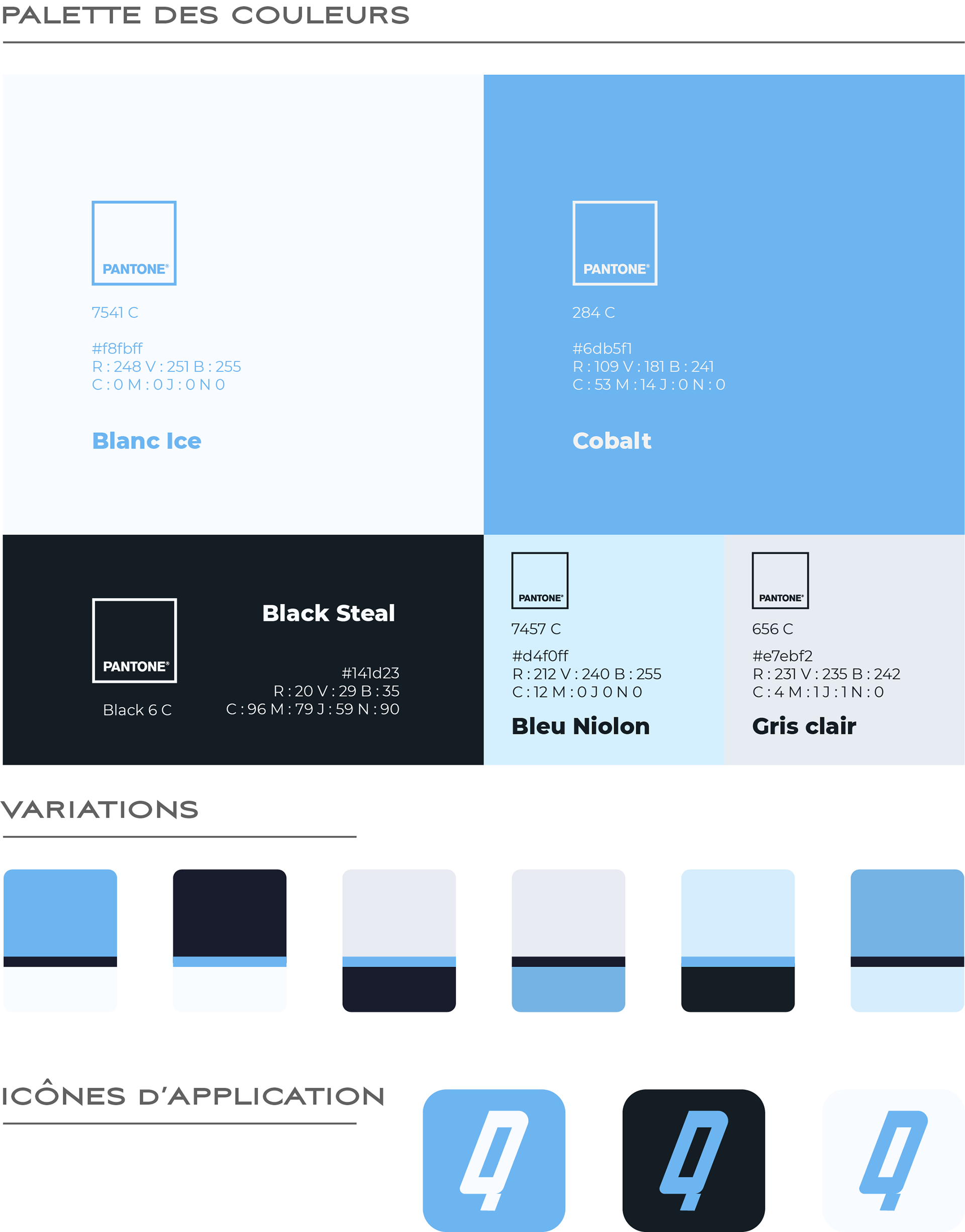 L’ambiance colorimétrique de l’identité s’articule autour d’un bleu cobalt, qui constitue le thème central de l’identité. Les autres teintes sont des variations ou des accentuations de cette couleur afin de la mettre en valeur tout au long du déploiement de l’identité visuelle. L’ensemble délivre un dynamisme mesuré qui dénote subtilement avec les brandings concurrent des métiers sportifs.