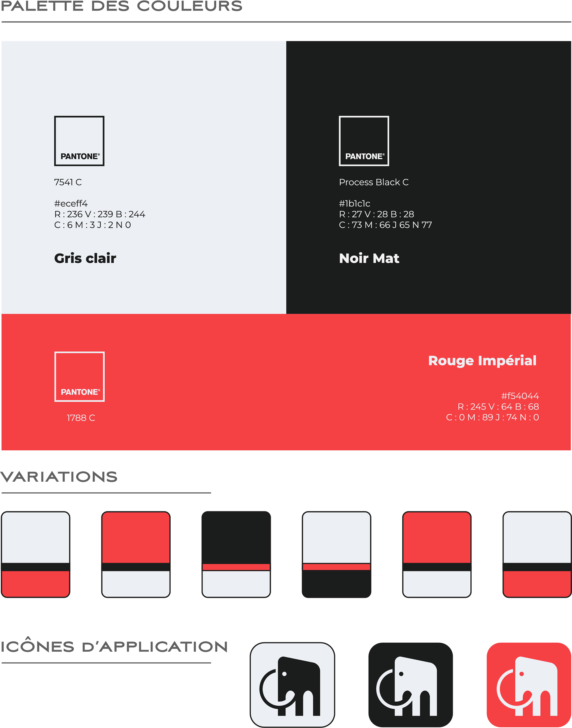 Les couleurs d’origine ont été conservées mais ont été rehaussées afin de donner un élan de modernité à la marque. Le rouge a été légèrement saturé et le blanc a fait place à un gris très clair, tournant vers un blanc ice. Le noir a également été décontrasté afin de conférer un toucher colorimétrique plus doux.