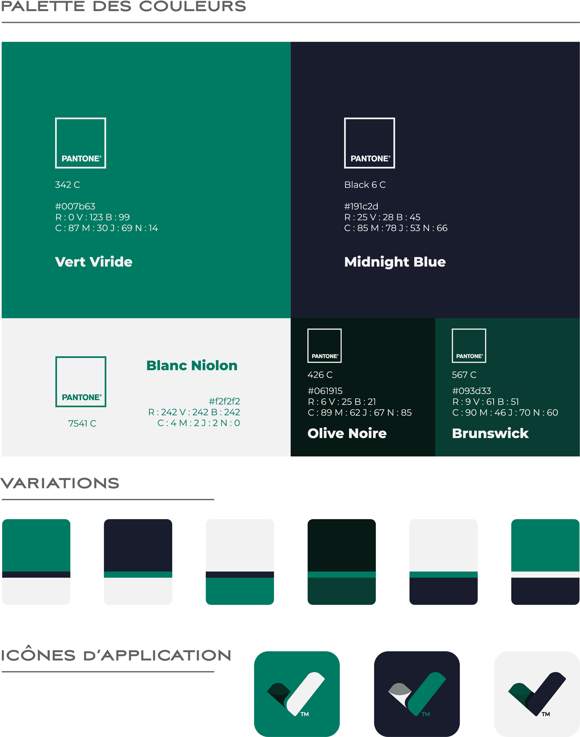 Sur ce branding, la palette de couleurs s’articule autour de trois teintes : un bleu nuit, qui assoit le professionnalisme du branding, rehaussé par un vert viride, apportant une sensation de sérénité, ainsi qu’un blanc pâle, qui accentue l’ensemble. Cette palette de couleurs permet au branding de dégager une atmosphère sérieuse et efficace, tout en suggérant une touche technologique.